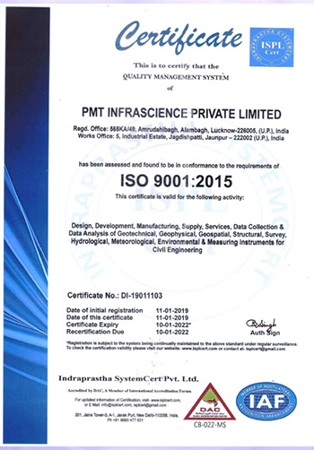 PMT, established in 1975 is an ISO 9001:2008 certified company (recertified in 2015) for design, manufacture, installation, monitoring and analysis of instruments for the geotechnical, geophysical, civil engineering, structural health monitoring, mining and environmental industries. For every challenging projects, we have access to the specialized knowledge of our world renowned board of experts and a network of partner companies both nationally and internationally.